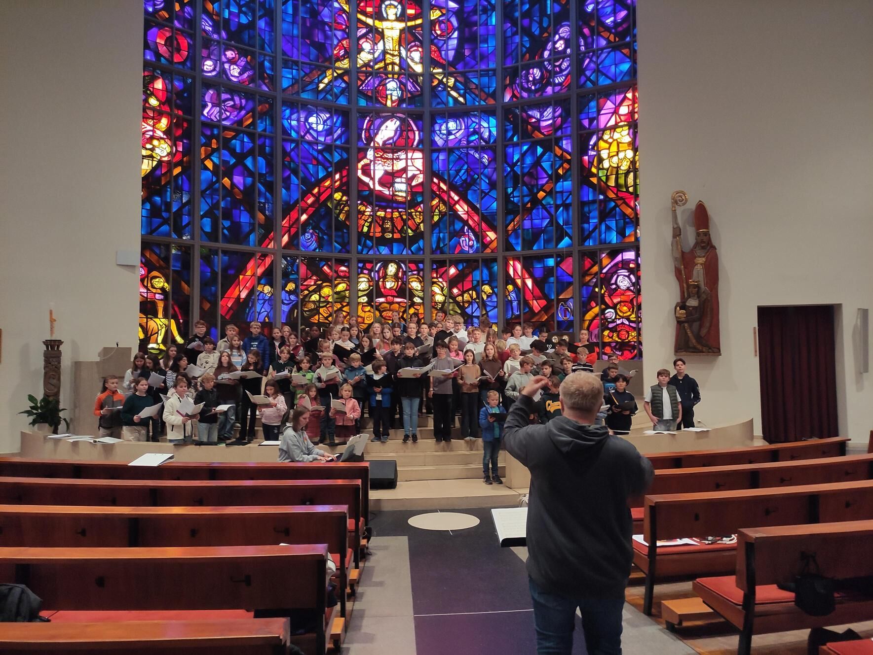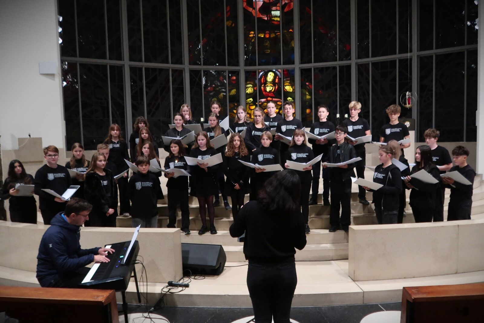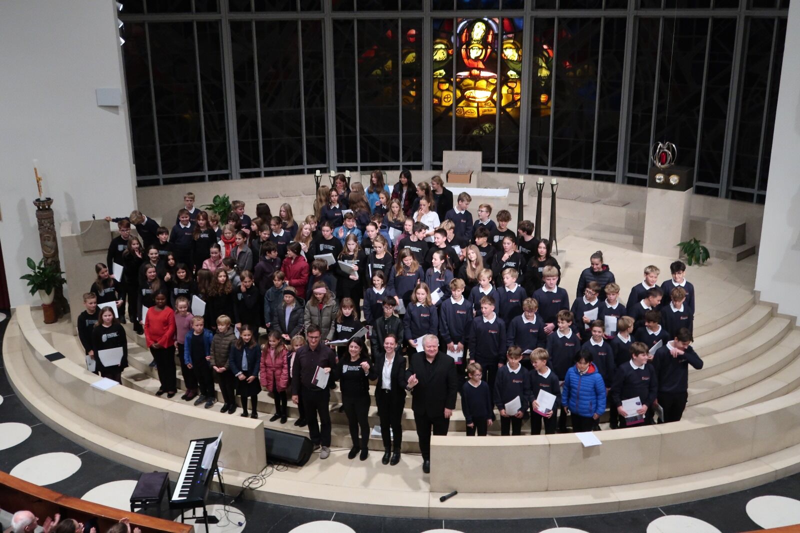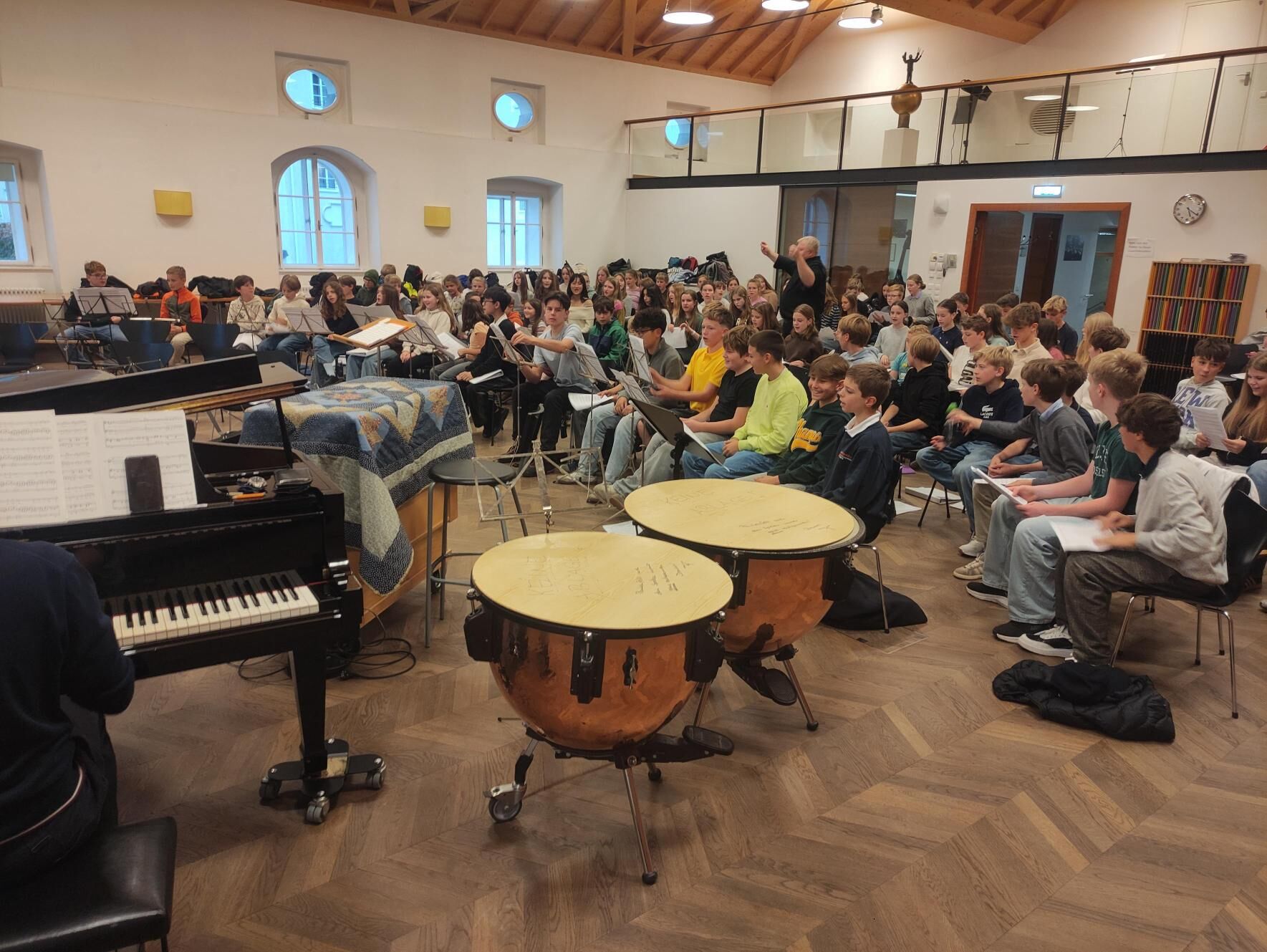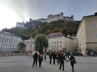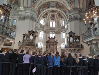 Von 17. bis 19. Oktober 2025 fuhren die Sängerinnen und Sänger der 3. und 4. Klassen mit Unterstützung einiger Zweitklässler:innen nach Salzburg, um mit den Sängerinnen und Sängern des Bischöflichen Gymnasiums Borromäum (Leitung: Hannah Lomes und Gerrit Stadlbauer) gemeinsam zu musizieren. Bereits am Freitag gab es eine gemeinsame Probe in den Räumlichkeiten der Dommusik Salzburg. Im Anschluss daran erkundeten wir gemeinsam die beeindruckende Innenstadt und spazierten über die Festung Hohensalzburg wieder zurück zum Quartier.