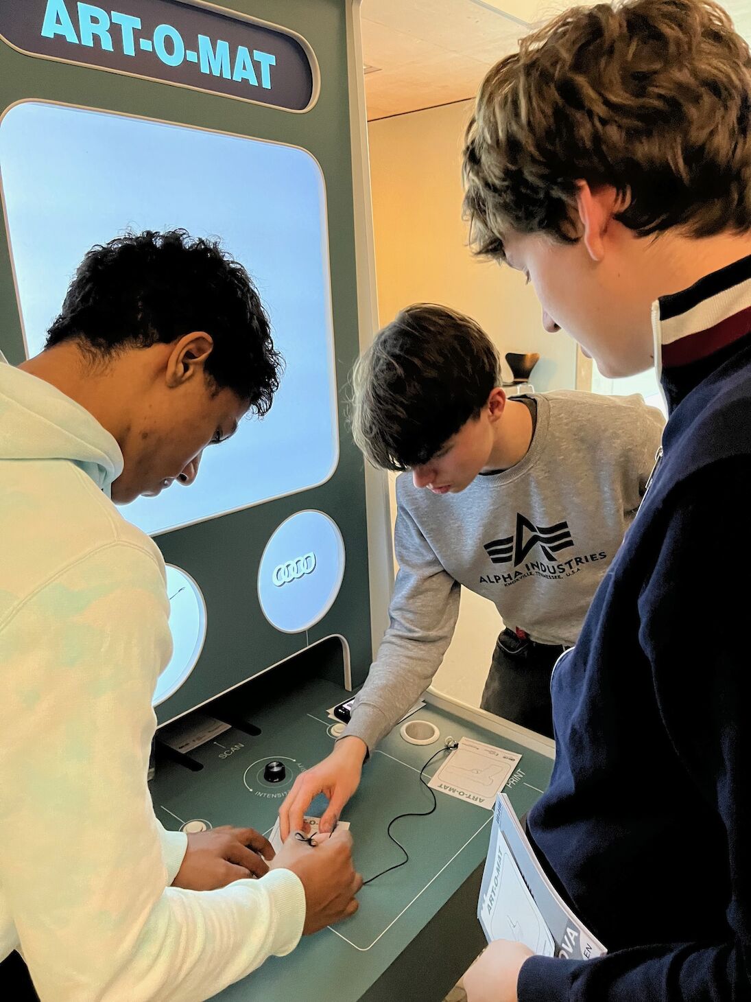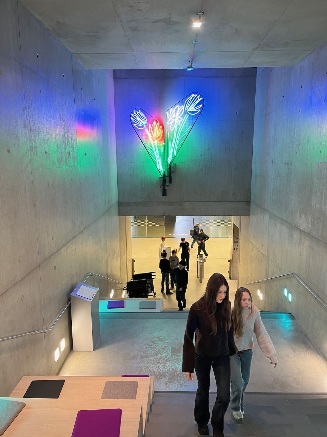 Im Museum der Moderne Mönchsberg besuchten wir mehrere Ausstellungen. Entropic Empire des niederländischen Künstlers Rob Voerman thematisierte das Spannungsfeld von Zerfall und Wachstum und regte zur Auseinandersetzung mit der Zukunft sowie dem Zusammenspiel von Wirtschaft, Ökologie und Gesellschaft an. In einem partizipativen Teil konnten wir selbst als „Architekt:innen“ tätig werden und utopische Bauwerke entwerfen. Die Ausstellung Cascade der britischen Künstlerin Nika Neelova führte in eine poetische Bildwelt, in der Vergangenheit, Gegenwart und Zukunft miteinander verschmelzen. Mit einem KI-Bildgenerator (ART-O-MAT) konnte jede:r von uns seine persönliche Zeichnung digital zum Leben erwecken.