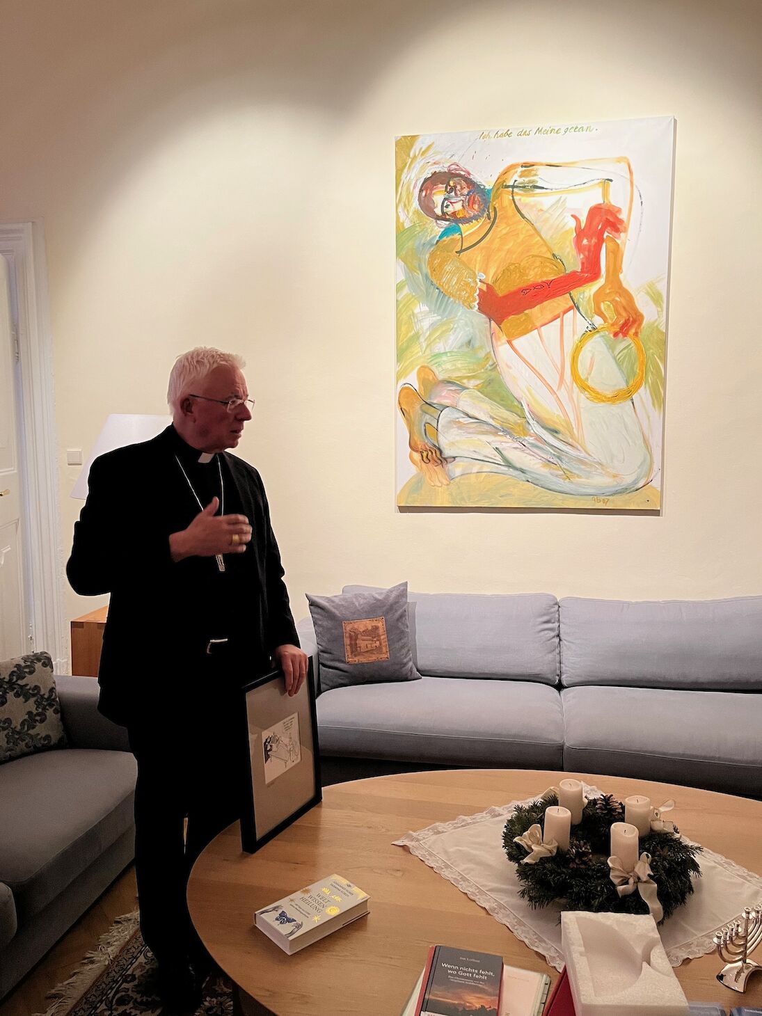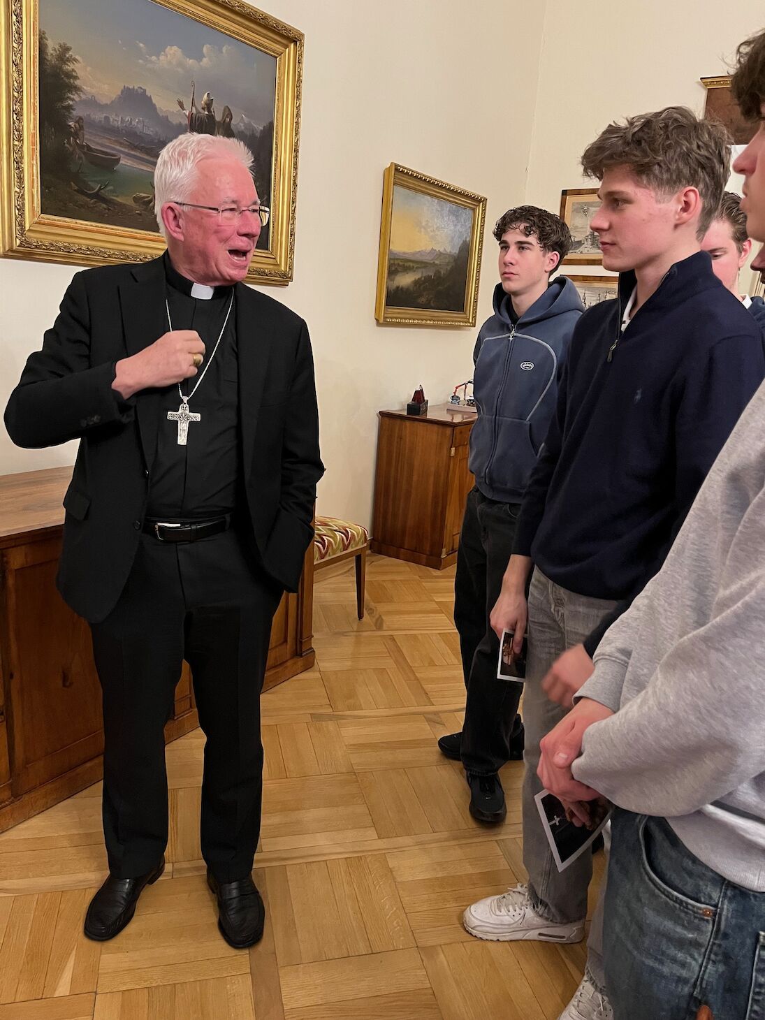 Das unbestrittene Highlight unserer Reise war der Empfang beim hochwürdigsten Herrn Erzbischof Dr. Franz Lackner in seiner Wohnung am Kapitelplatz. Eineinhalb Stunden lang nahm er sich Zeit für unsere Gruppe, schilderte seinen persönlichen Werdegang, motivierte zum Lesen und begeisterte uns für Philosophie. Er zeigte große Offenheit für unsere Gedanken und beantwortete unsere Fragen ausführlich und mit spürbarer Geduld. Besonders eindrucksvoll war seine Interpretation eines Bildes des heiligen Franziskus von Gerald Brettschuh, das er auf inspirierende Weise erläuterte. In seiner privaten Kapelle, gestaltet von Salzburger Künstlerinnen und Künstlern, beteten wir gemeinsam und empfingen schließlich den erzbischöflichen Segen – ein würdiger und berührender Abschluss unserer gemeinsamen Tage in Salzburg.
