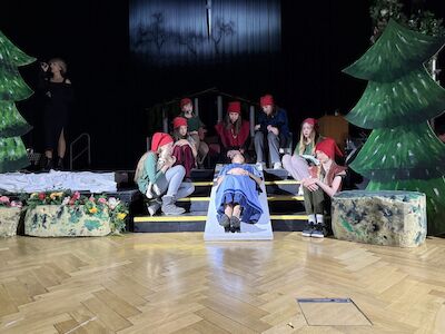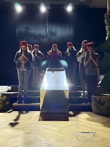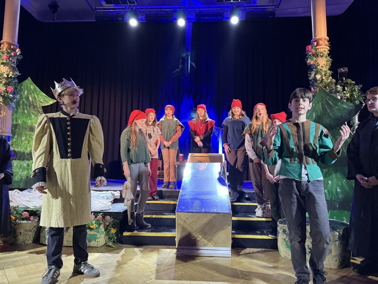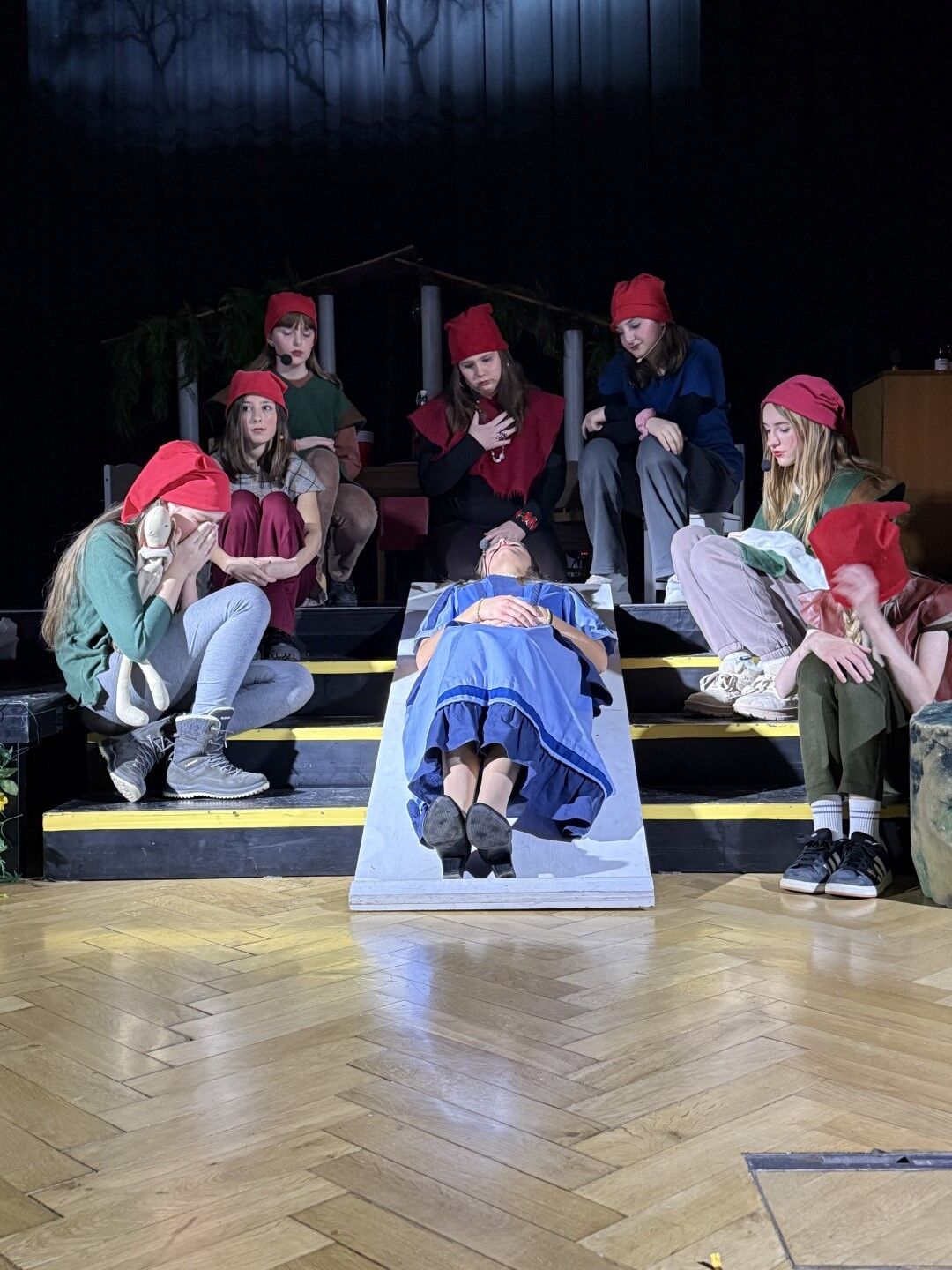 HOFFNUNG - ANGST - GLÜCK, das sind die ständigen Begleiter von Schneewittchen und ihren 7 Zwergen. 35 SUS haben in den unterschiedlichsten Rollen samt „Handlungsneuzugang Zauberer Morgul“ die Handlung erzählt. 3 Schülerinnen haben dem Publikum durch ihren Sologesang spezielle und emotionale Momente beschert. Über 70 SuS der 1. und 2. Klassen haben im Sinne der griechischen Tragödie dem Publikum den königlichen Aufmarsch, den Auftritt der 7 Zwerge und Schneewittchens Traum anschaulich erklärt.