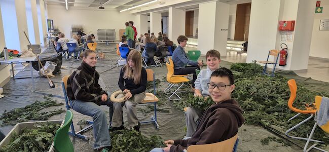70 Schülerinnen und Schüler binden aus diesem Grund große und kleine Adventkränze für ihre jeweiligen Klassen und für viele Institutionen im Augustinum.