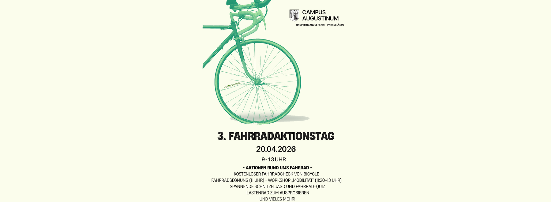Am 20. April 2026 findet im Rahmen der Nachhaltigkeitswoche am Campus Augustinum der 3. Fahrradaktionstag statt. Von 9 bis 13 Uhr erwartet Schülerinnen und Schüler, Studierende, Lehrkräfte sowie alle Interessierten ein abwechslungsreiches Programm rund ums Fahrrad.