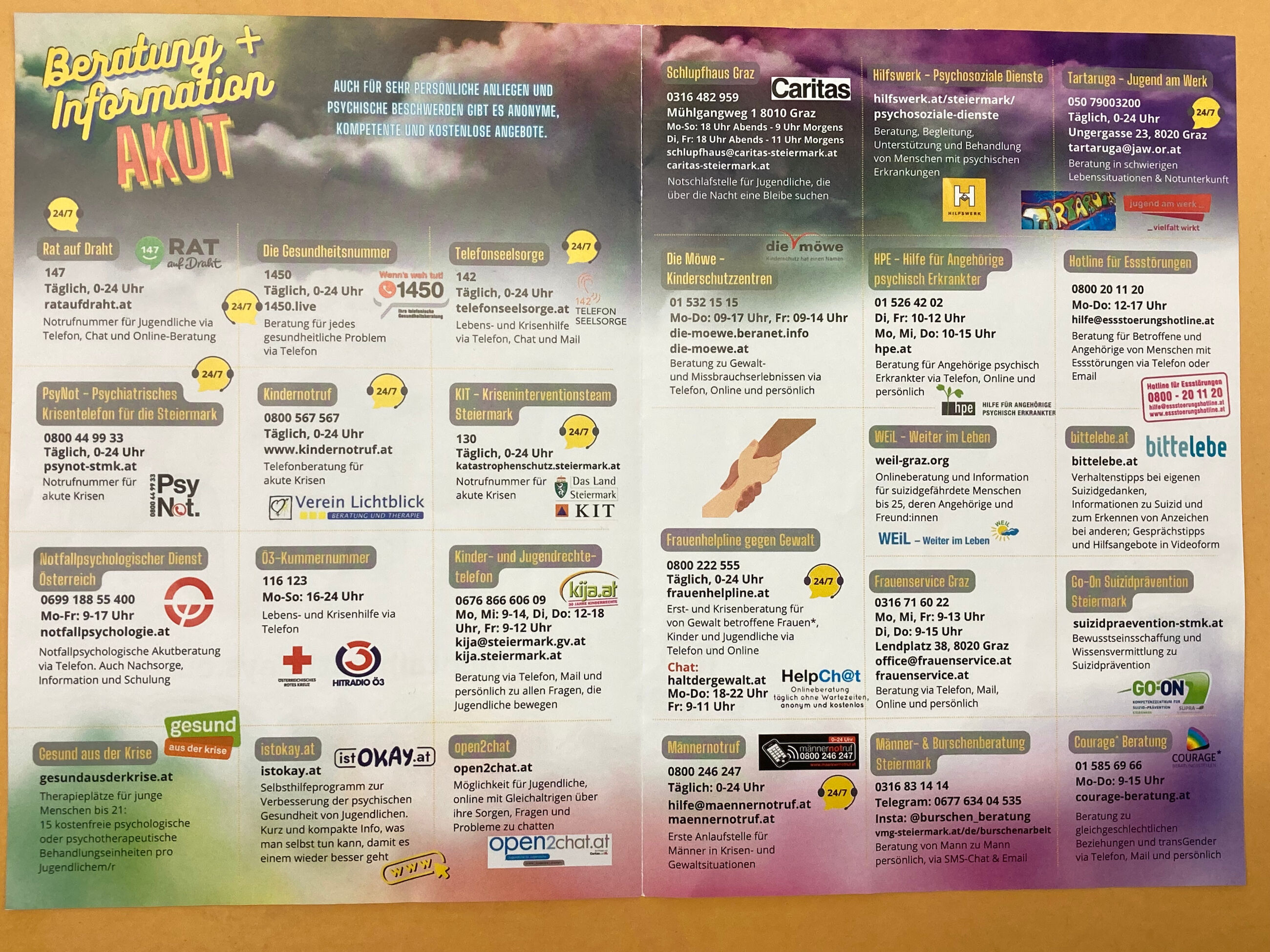 Heuer wurden am 11./ 12. September 2025 bereits zum dritten Mal allen Schülerinnen und Schülern klassenübergreifend und altersgerecht Informationen zu Krisenbewältigungsstrategien, Hilfsangeboten und Anlaufstellen vermittelt, sowie das erweiterte schulinterne Supportteam vorgestellt. Die drängendsten Themen psychischer Gesundheit (Mobbing, Körperbewusstsein, Handy- und Internetabhängigkeit, Leistungsdruck, Sucht, Depression, Suizidalität, Existenzängste) waren zwei Tage lang Thema und standen im Fokus. Auf diese Weise wollen auch wir durch die Förderung von Mental Health Literacy zur Entstigmatisierung und Enttabuisierung psychischer Krankheiten, einem höheren Wohlbefinden, mehr Resilienz und Lebenskompetenz beitragen. (Studie Donau Universität Krems, 2021, Umfrage ÖGJ/Donau Universität Krems/Med Uni Wien, 2021)
