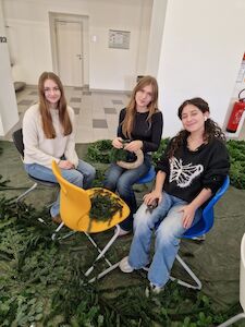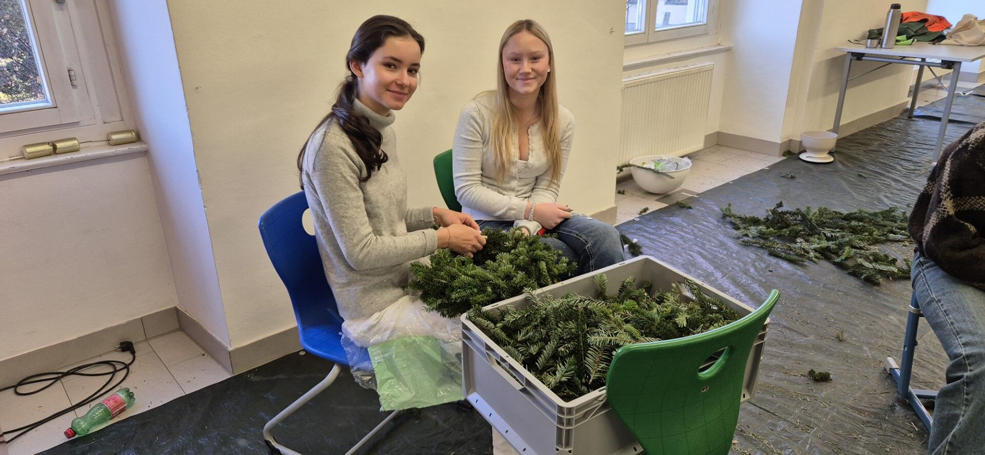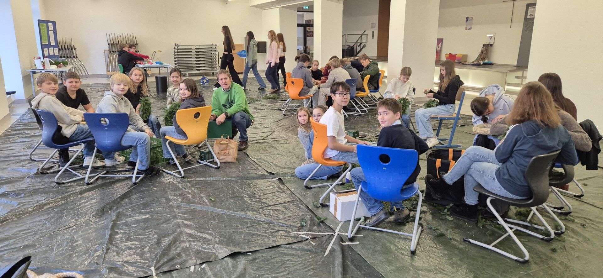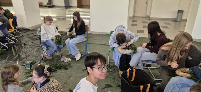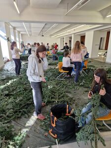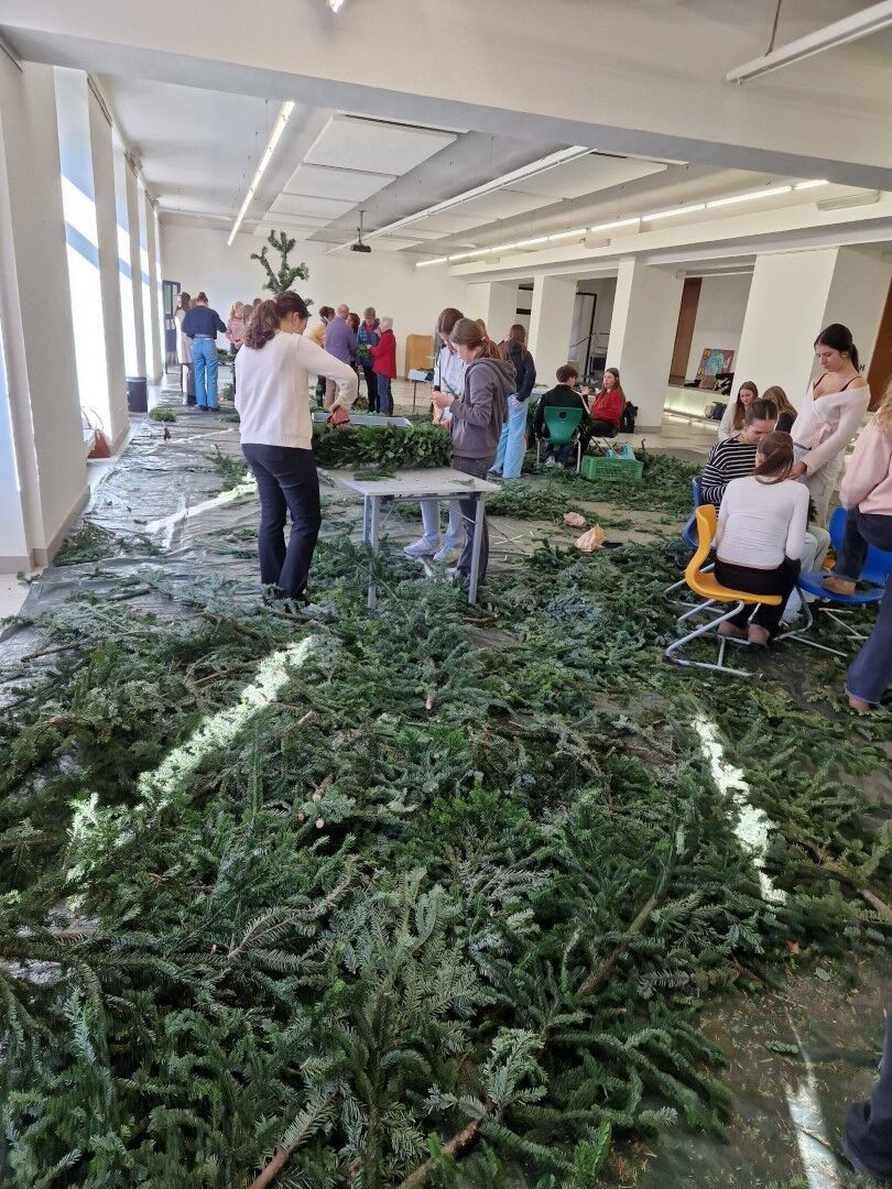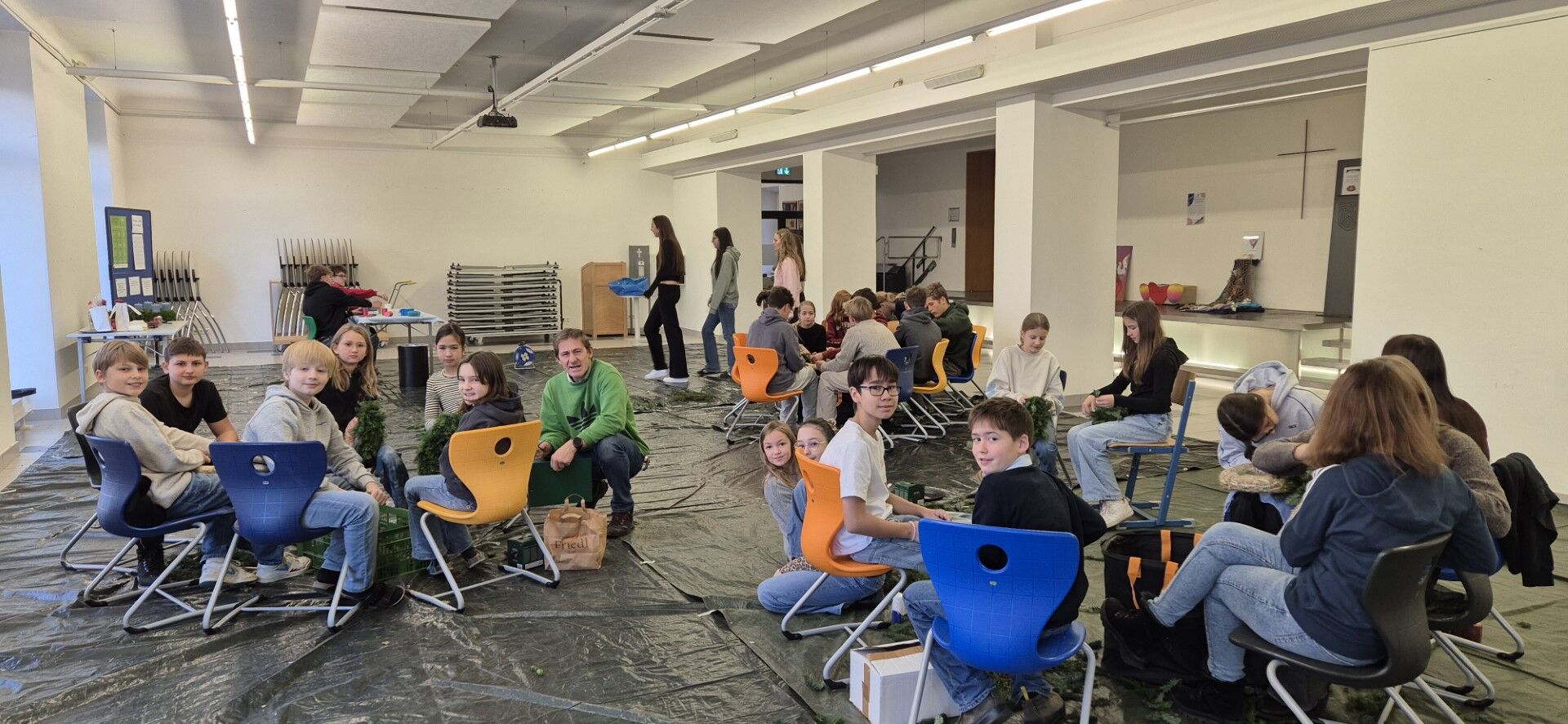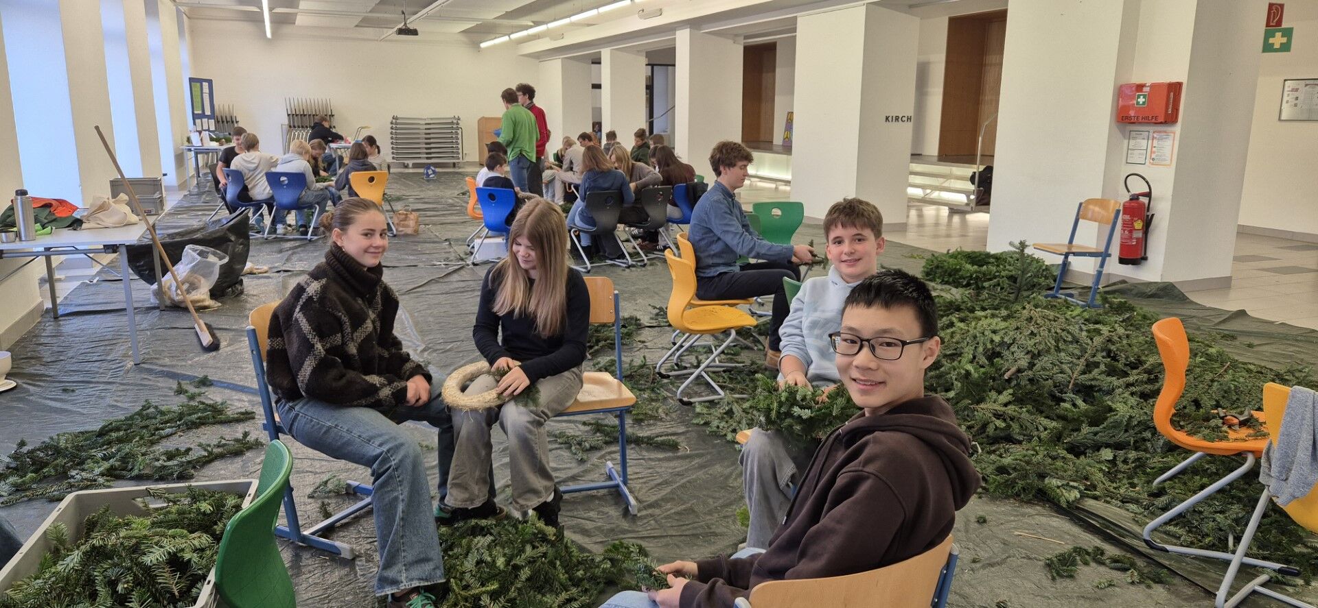 70 Schülerinnen und Schüler binden aus diesem Grund große und kleine Adventkränze für ihre jeweiligen Klassen und für viele Institutionen im Augustinum.