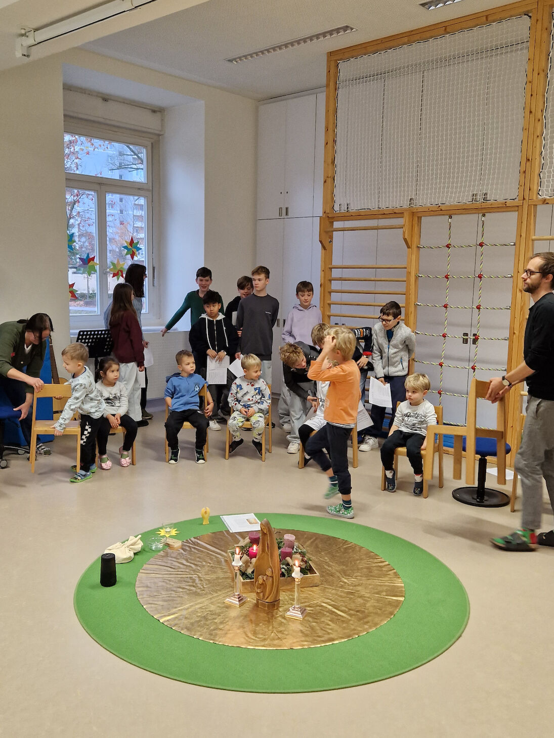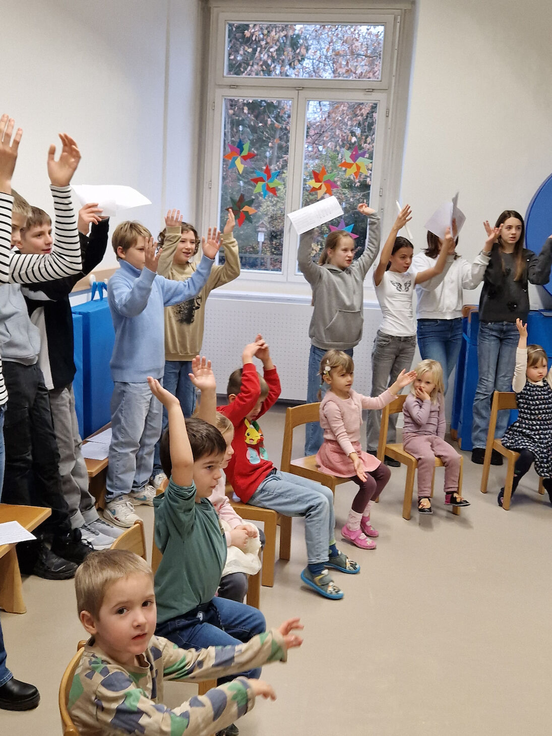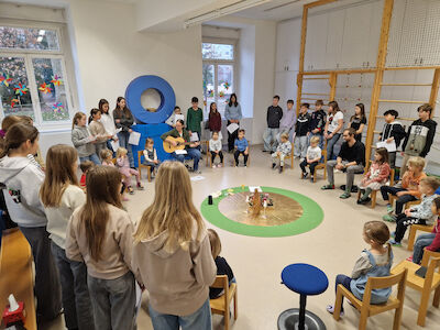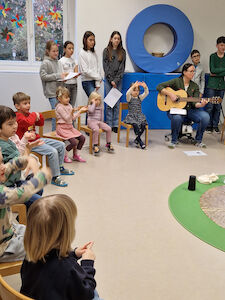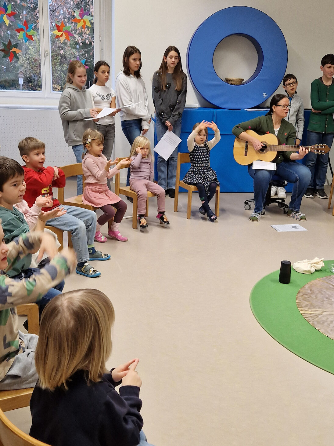 Schüler*innen der 2B-Klasse baten um Aufnahme im privaten Kindergarten im Haus und wurden von leuchtenden Kinderaugen liebenswert empfangen. Abwechselnd wurden Lieder gesungen und Geschichten erzählt, bis eine Tanzperformance den netten Besuch abschlossen.